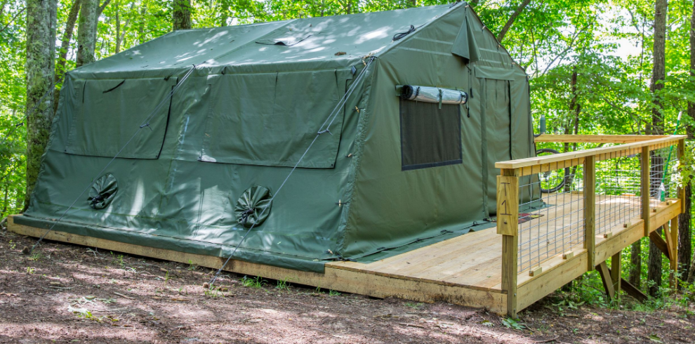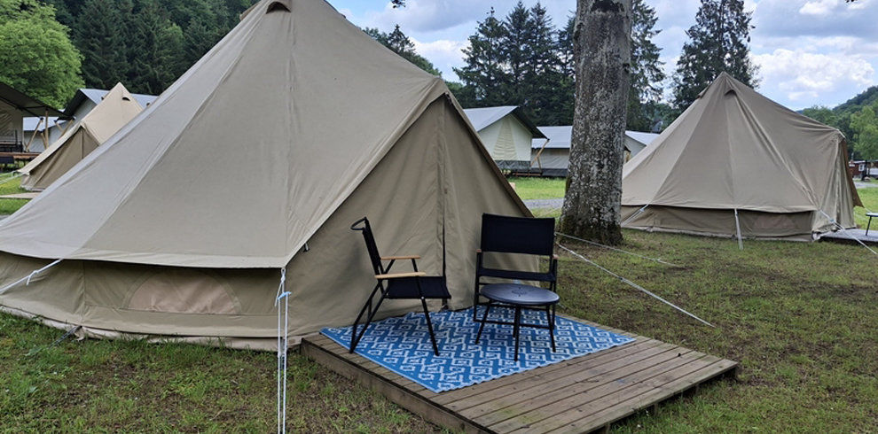 De camouflage groene tenten zijn van alle gemakken voorzien, zoals een mooi houten terras, een comfortabel 2-persoonsbed, verlichting, inventaris, tafel, fijne stoelen, een stoere picknick tafel op het terras, etc.