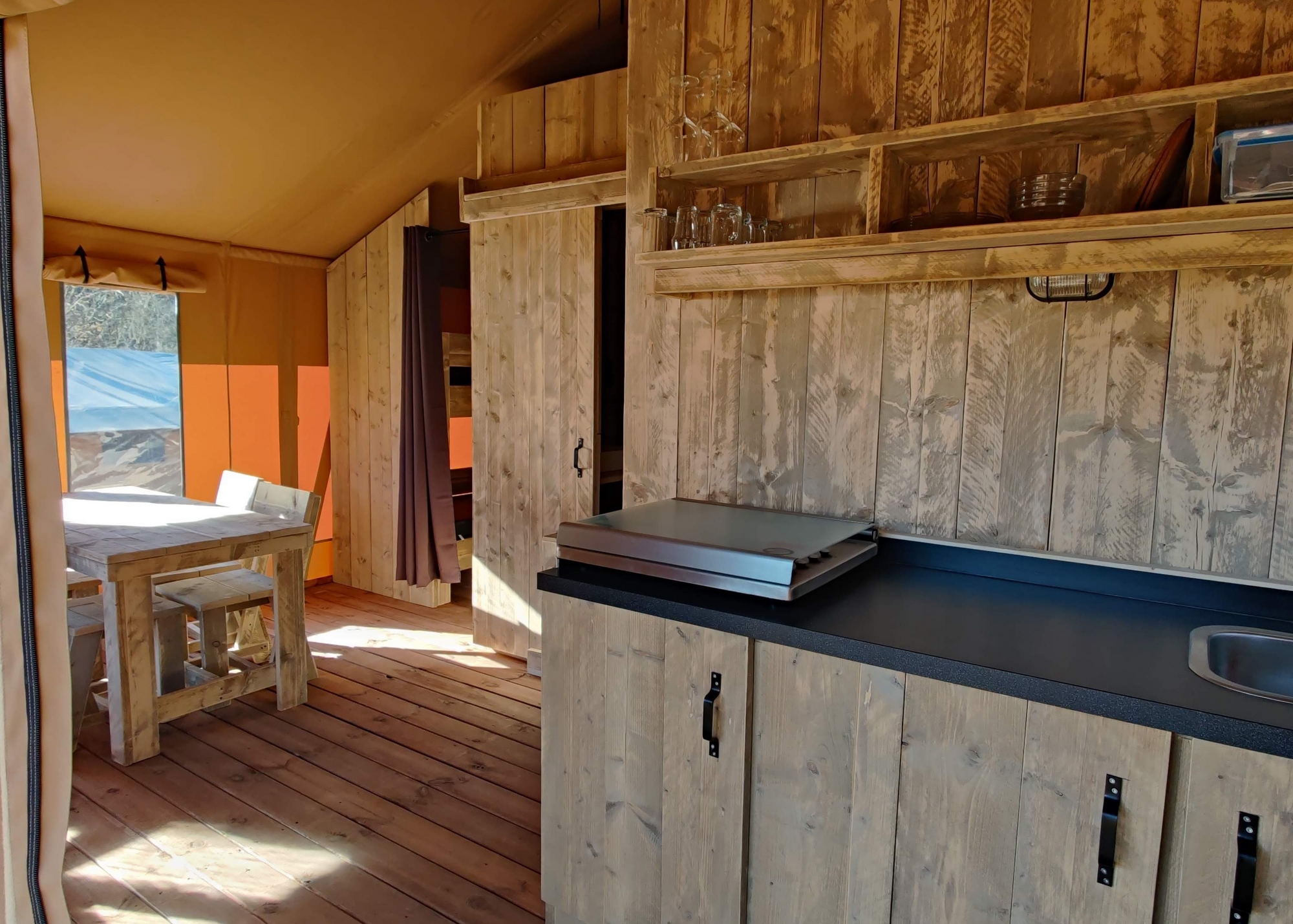 Op onze camping staan luxe, geheel ingerichte, nieuwe safaritenten met Sanitair geschikt voor 1 persoon. De tenten staan in het midden van de camping en zijn van alle gemakken voorzien, zoals een mooi houten terras, een echt fijn 2-persoonsbed in de slaapkamer, verlichting, inventaris, tafel, fijne stoelen, etc. Je hebt in de tent een badkamer met eigen douche, toilet en wastafel. En de accommodatie is zeer ruim. Lekker luxe!
